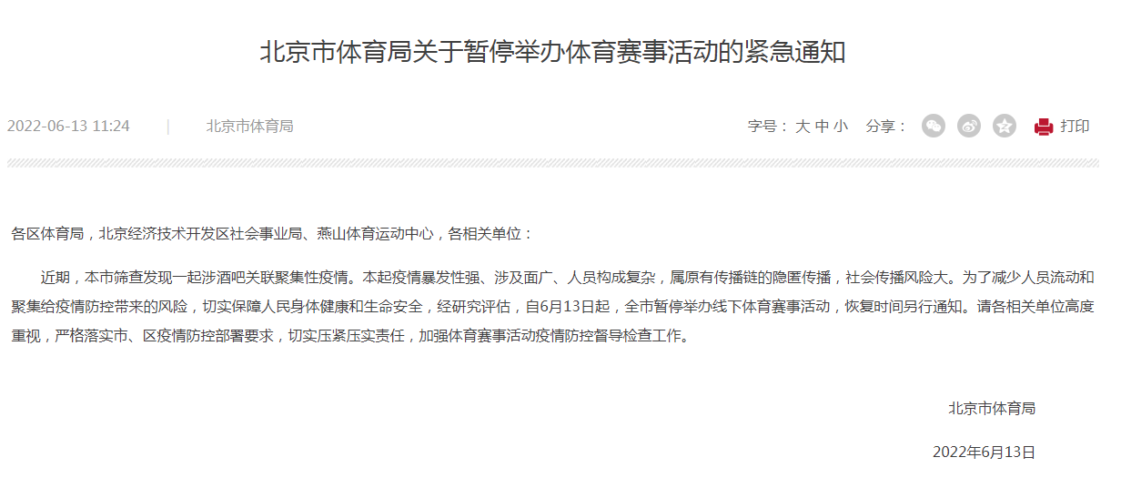 上证报中国证券网讯 据北京市体育局6月13日消息,北京市体育局今日发布关于暂停举办体育赛事活动的紧急通知称,自6月13日起,全市暂停举办线下体育赛事活动,恢复时间另行通知。