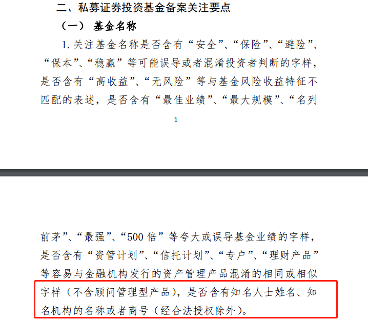 记者注意到,中基协6月2日发布了《关于私募基金管理人登记备案工作相关事宜的通知》。中基协在通知附件《私募证券投资基金备案关注要点》中指出:私募证券投资基金的名称要关注是否含有知名人士姓名、知名机构的名称或者商号(经合法授权除外)。