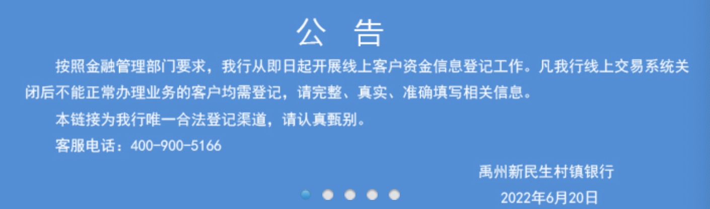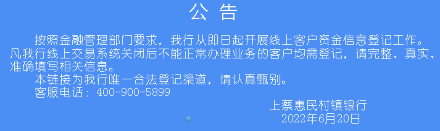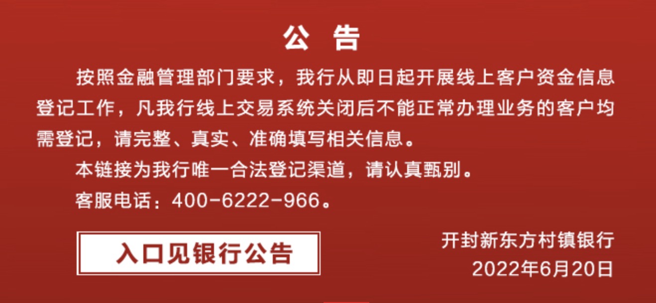 上证报中国证券网讯(记者 张琼斯)河南个别村镇银行相关事件又有新进展。禹州新民生村镇银行、开封新东方村镇银行、柘城黄淮村镇银行、上蔡惠民村镇银行6月20日均在官网发布公告称,按照金融管理部门要求,从即日起开展线上客户资金信息登记工作,凡上述银行线上交易系统关闭后不能正常办理业务的客户均需登记。