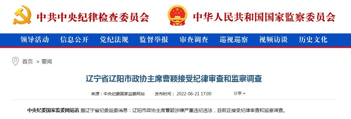 辽宁省辽阳市政协主席曹颖接受纪律审查和监察调查