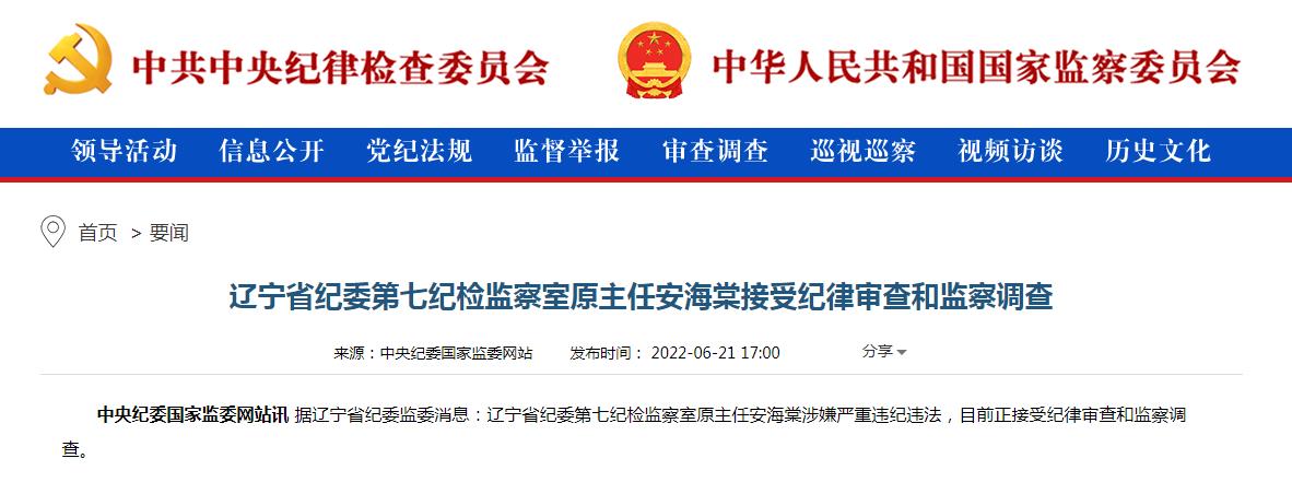 辽宁省纪委第七纪检监察室原主任安海棠接受纪律审查和监察调查