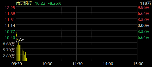 上证报中国证券网讯 6月30日,南京银行早盘快速下行,盘中一度触及跌停。截至9:51,南京银行跌逾8%,成交额超12亿元。