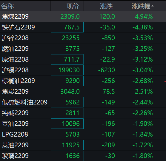 国内期市夜盘多数商品价格下跌 焦煤及铁矿石主力合约跌幅超4%