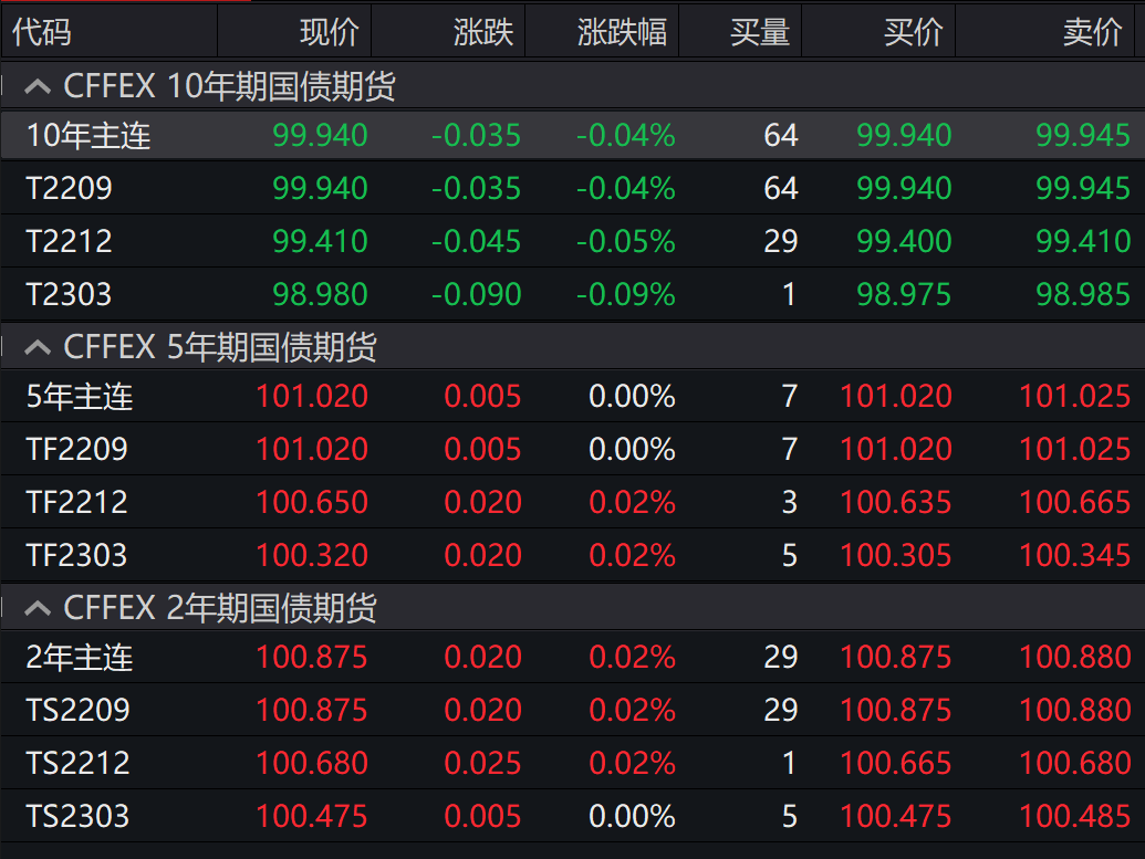上证报中国证券网讯 7月8日,国债期货各主力合约涨跌不一。截至收盘,10年期国债期货(T2209)报收99.940元,下跌0.035元,跌幅0.03%;5年期国债期货(TF2209)报收101.020元,上涨0.005元,涨幅0.00%;2年期国债期货(TS2209)报收100.875元,上涨0.020元,涨幅0.02%。(何奎)