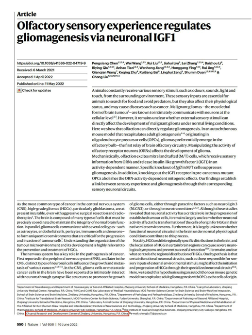 当前,脑疾病的研究正在如火如荼的进行,除了依赖神经生物学之外,脑机集合的融合应用也在发挥重要的作用。据悉,此次入刊《自然(Nature)》杂志的研究成果为《嗅觉体验通过神经元IGF-1调节胶质瘤的发生》。在本次研究中,由传奇创新中心支持的脑机接口前沿研究,在脑疾病调控机制方面取得突破,也为项目成功提供了重要的支持。