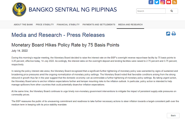 菲律宾上调利率75个基点至3.25%