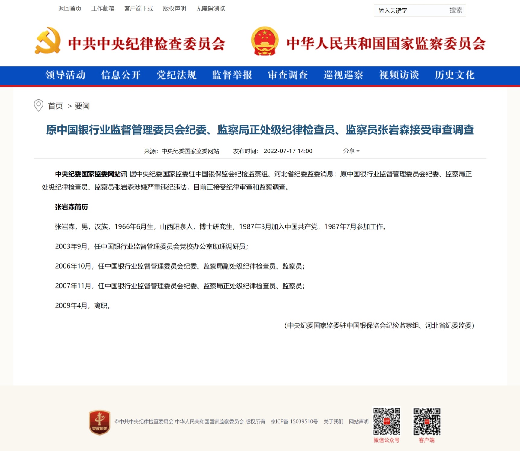 原中国银行业监督管理委员会纪委、监察局正处级纪律检查员、监察员张岩森接受审查调查