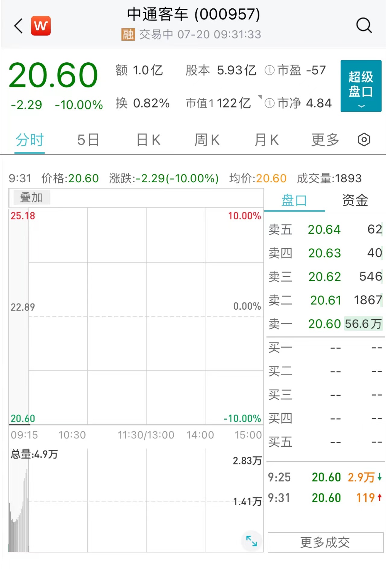 中通客车开盘一字跌停