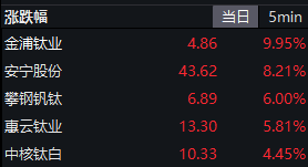 上证报中国证券网讯 7月20日A股午后交易时段,钛白粉板块个股拉升。13时37分,金浦钛业涨停,安宁股份上涨超过8%,攀钢钒钛上涨6%。