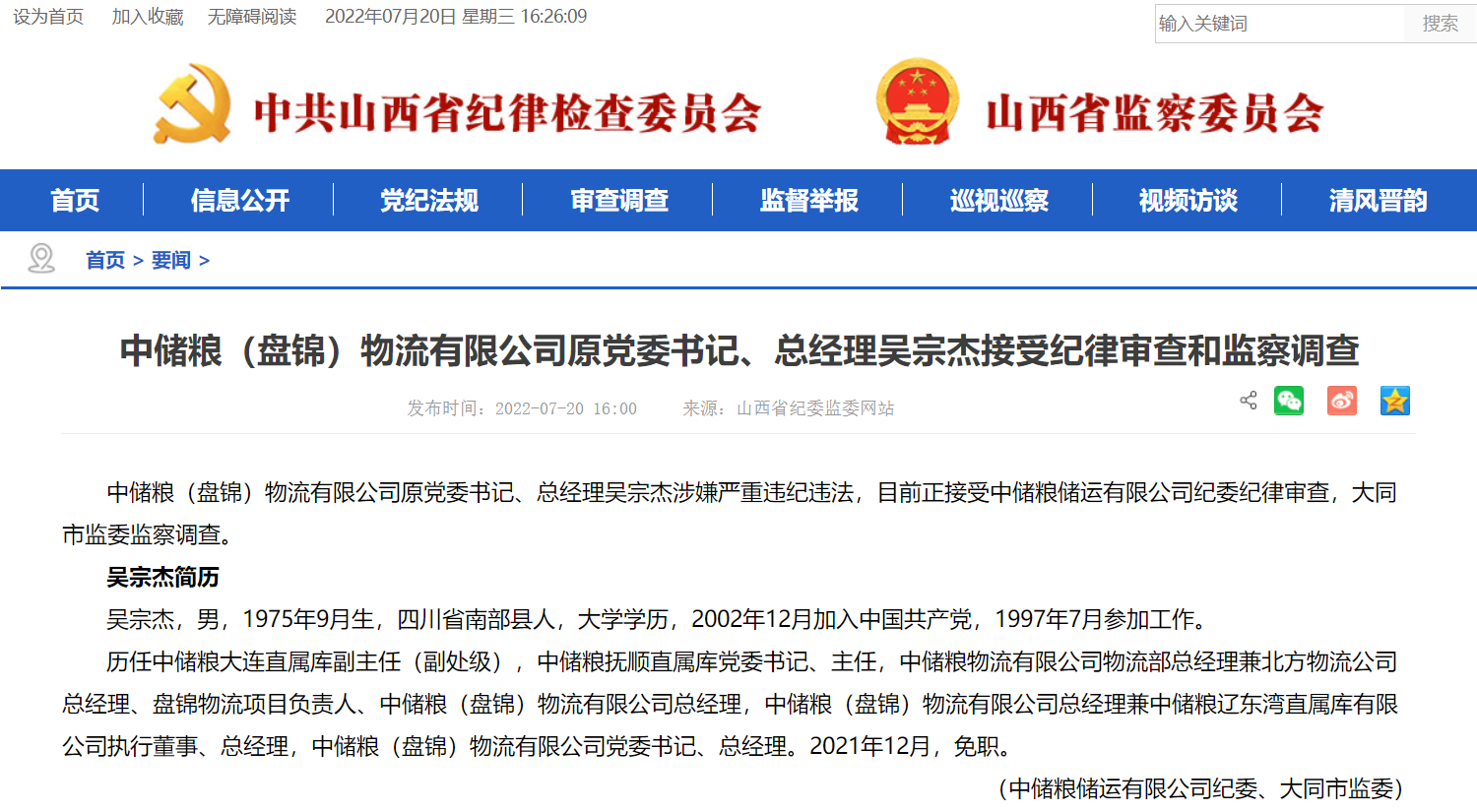 上证报中国证券网讯 据山西省纪委监委网站7月20日消息,中储粮(盘锦)物流有限公司原党委书记、总经理吴宗杰涉嫌严重违纪违法,目前正接受中储粮储运有限公司纪委纪律审查,大同市监委监察调查。