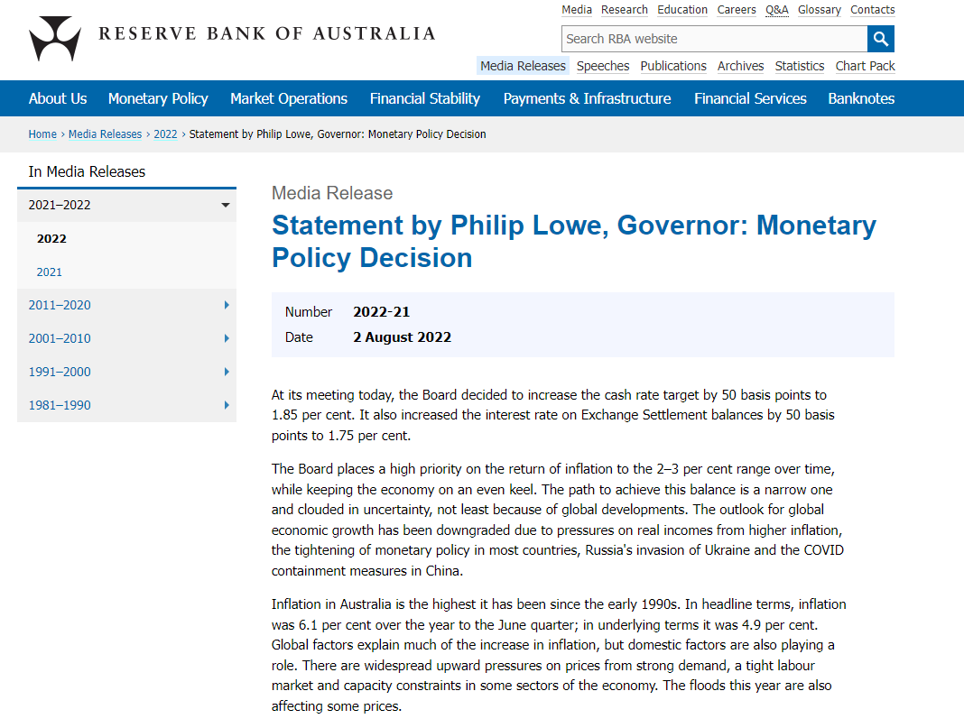 上证报中国证券网讯 澳大利亚央行8月2日宣布,加息50个基点至1.85%,符合市场预期。这是该央行连续第3次加息50个基点。在货币政策声明中,澳大利亚央行表示,预计通胀将在今年晚些时候达到峰值,然后回落至2%至3%的区间。该央行承诺,将采取必要措施,确保通胀随着时间推移恢复到目标水平。