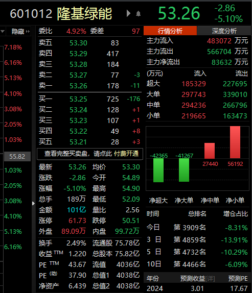 上证报中国证券网讯 8月22日14时14分,隆基绿能成交额突破100亿元,股价下跌超过5%。
