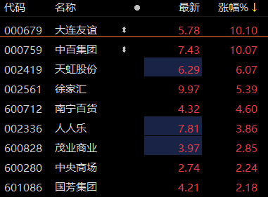 上证报中国证券网讯 9月14日上午交易时段,零售股异动上涨。10时51分,大连友谊直线拉升封板。中百集团涨停,天虹股份上涨超6%。