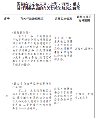 一、按照《国务院关于同意在天津、上海、海南、重庆开展服务业扩大开放综合试点的批复》(国函〔2021〕37号),同意自即日起至2024年4月8日,在相关省市暂时调整实施《旅行社条例》、《民办非企业单位登记管理暂行条例》的有关规定(目录附后)。