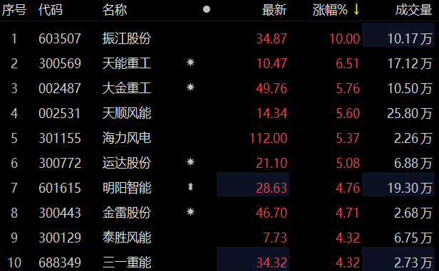 上证报中国证券网讯 10月21日,风电板块快速拉升,截至9:43,振江股份涨停,天能重工、大金重工、金雷股份等走高。