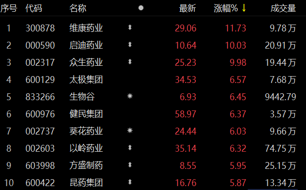 中药板块走高 启迪药业、众生药业涨停
