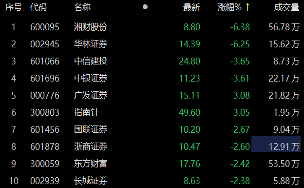 券商板块走低 湘财股份、华林证券跌逾6%