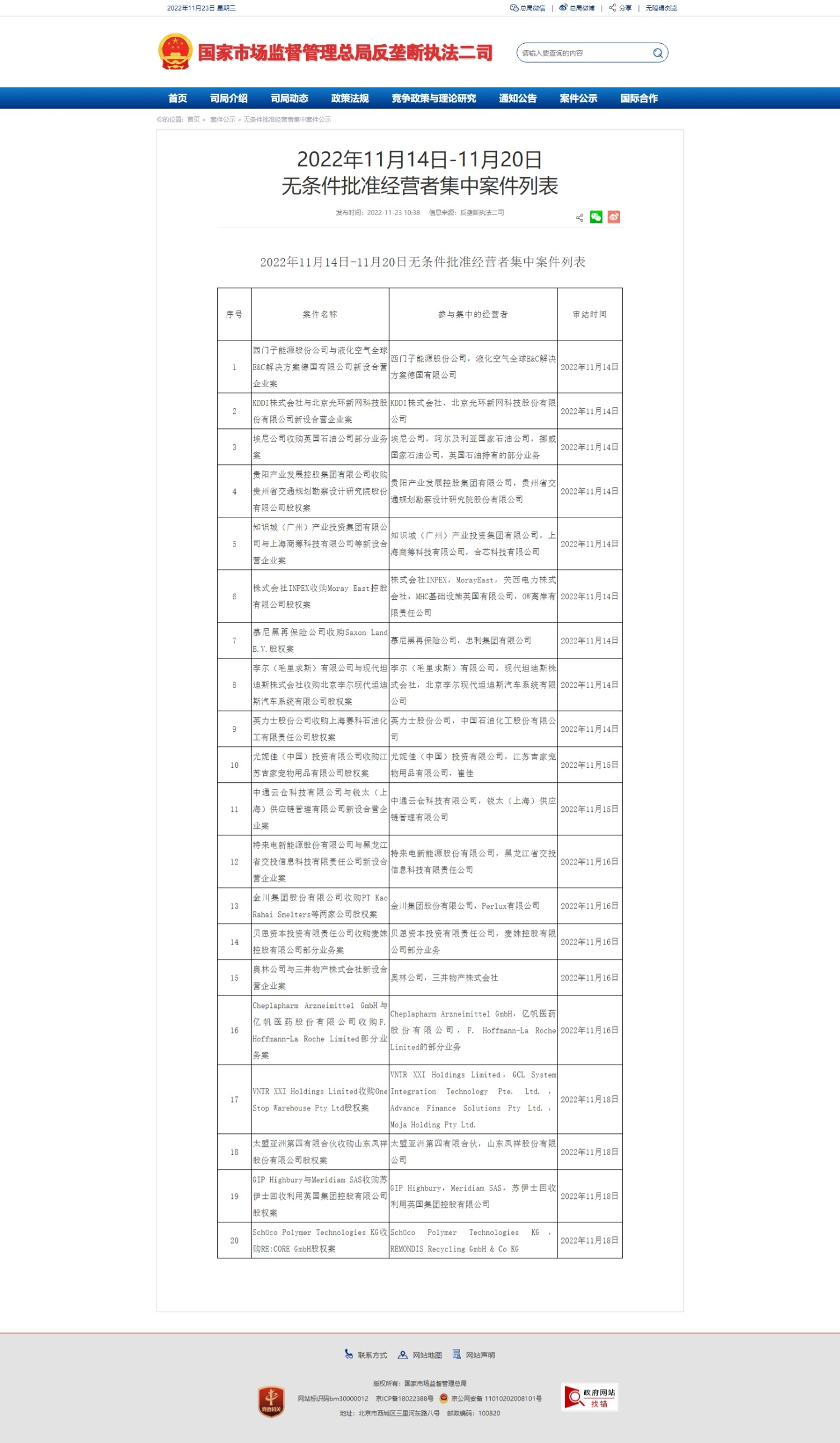 市场监管总局公布11月14日-11月20日无条件批准经营者集中案件列表