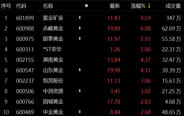 上证报中国证券网讯 1月9日,黄金股午后拉升,截至14:29,紫金矿业逼近涨停,赤峰黄金、银泰黄金等涨超5%。
