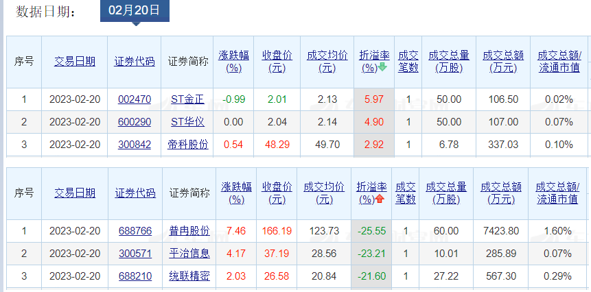 成交价方面,ST金正、ST华仪、帝科股份溢价率居前,溢价率依次为5.97%、4.90%、2.92%;普冉股份、平治信息、统联精密折价率居前,折价率依次为25.55%、23.21%、21.60%。