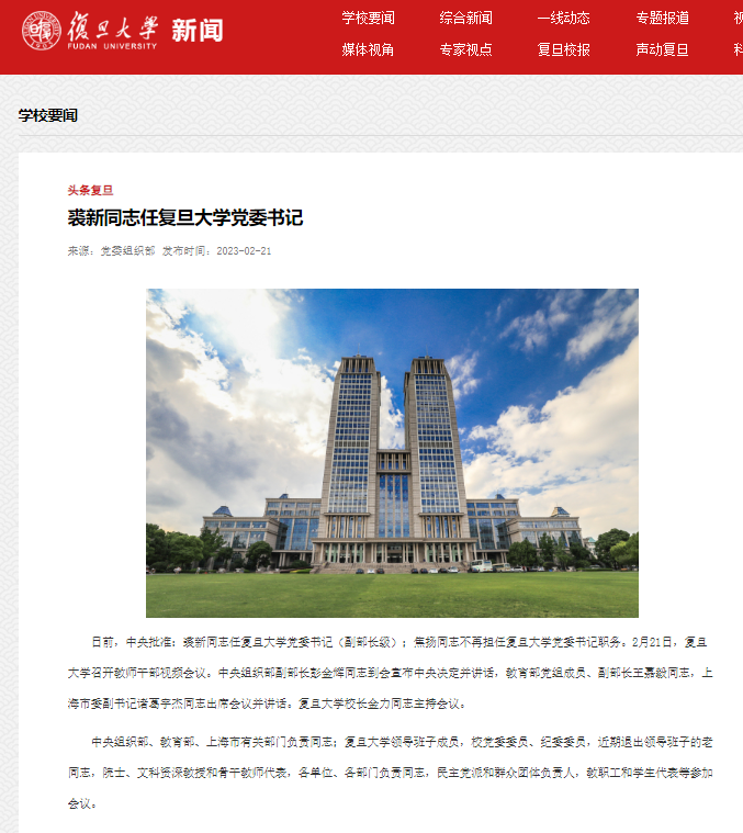 上证报中国证券网讯 据复旦大学2月21日消息,日前,中央批准:裘新同志任复旦大学党委书记(副部长级);焦扬同志不再担任复旦大学党委书记职务。2月21日,复旦大学召开教师干部视频会议。中央组织部副部长彭金辉同志到会宣布中央决定并讲话,教育部党组成员、副部长王嘉毅同志,上海市委副书记诸葛宇杰同志出席会议并讲话。复旦大学校长金力同志主持会议。