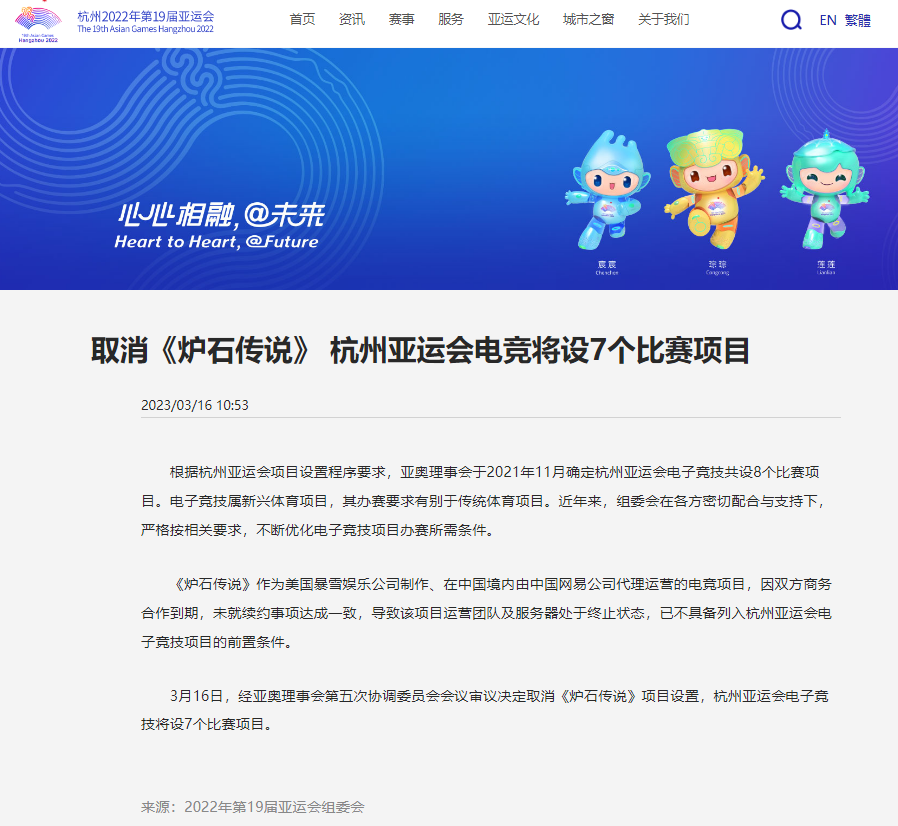 3月16日,经亚奥理事会第五次协调委员会会议审议决定取消《炉石传说》项目设置,杭州亚运会电子竞技将设7个比赛项目。