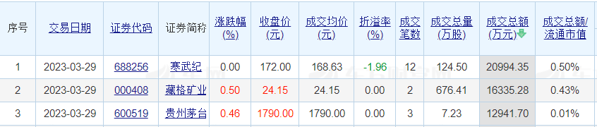 上证报中国证券网讯 据东方财富Choice数据,昨日(3月29日)两市共77只个股发生大宗交易,总成交21.34亿元,其中寒武纪-U、藏格矿业、贵州茅台成交额居前,成交额依次为2.1亿元、1.63亿元、1.29亿元。