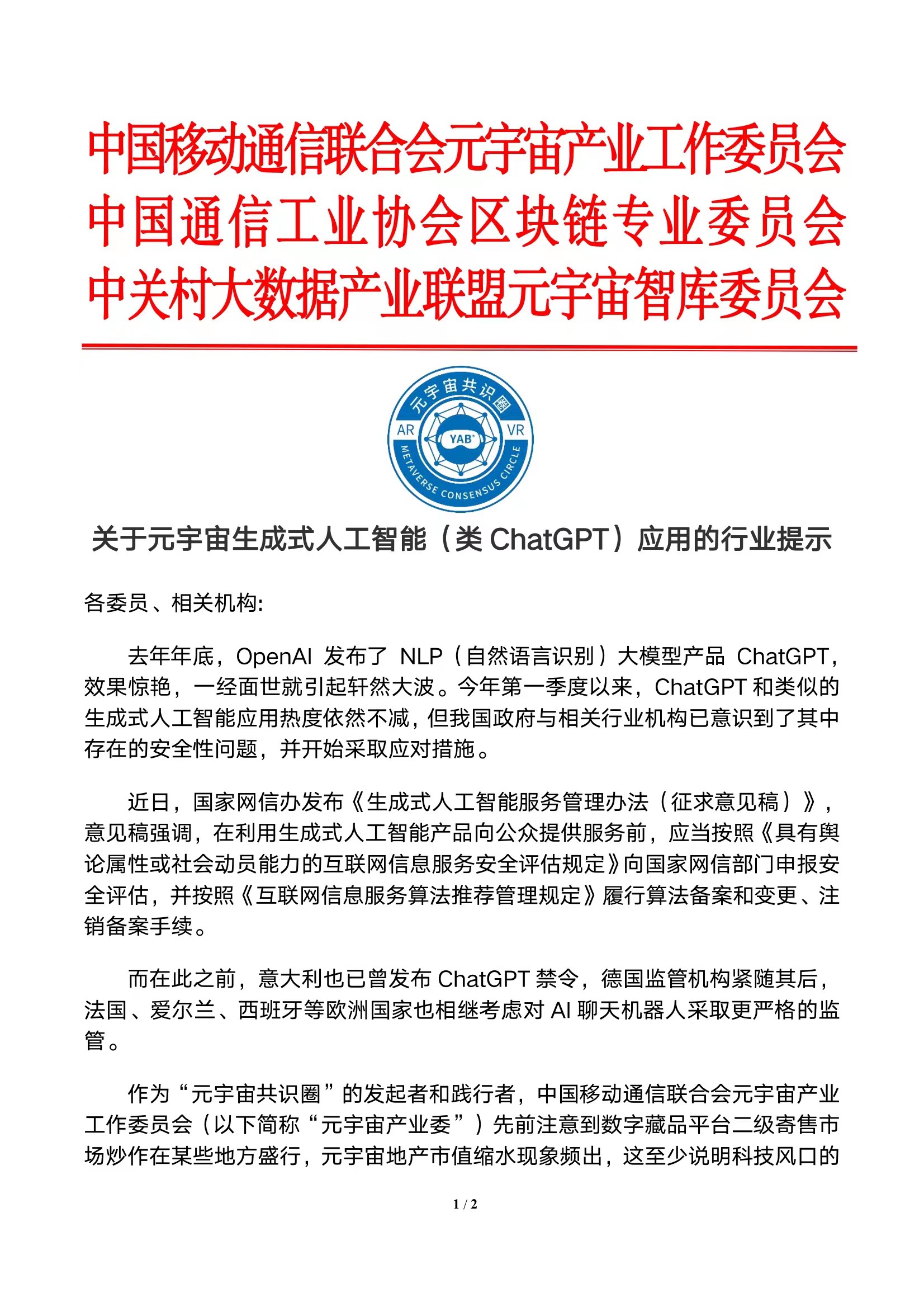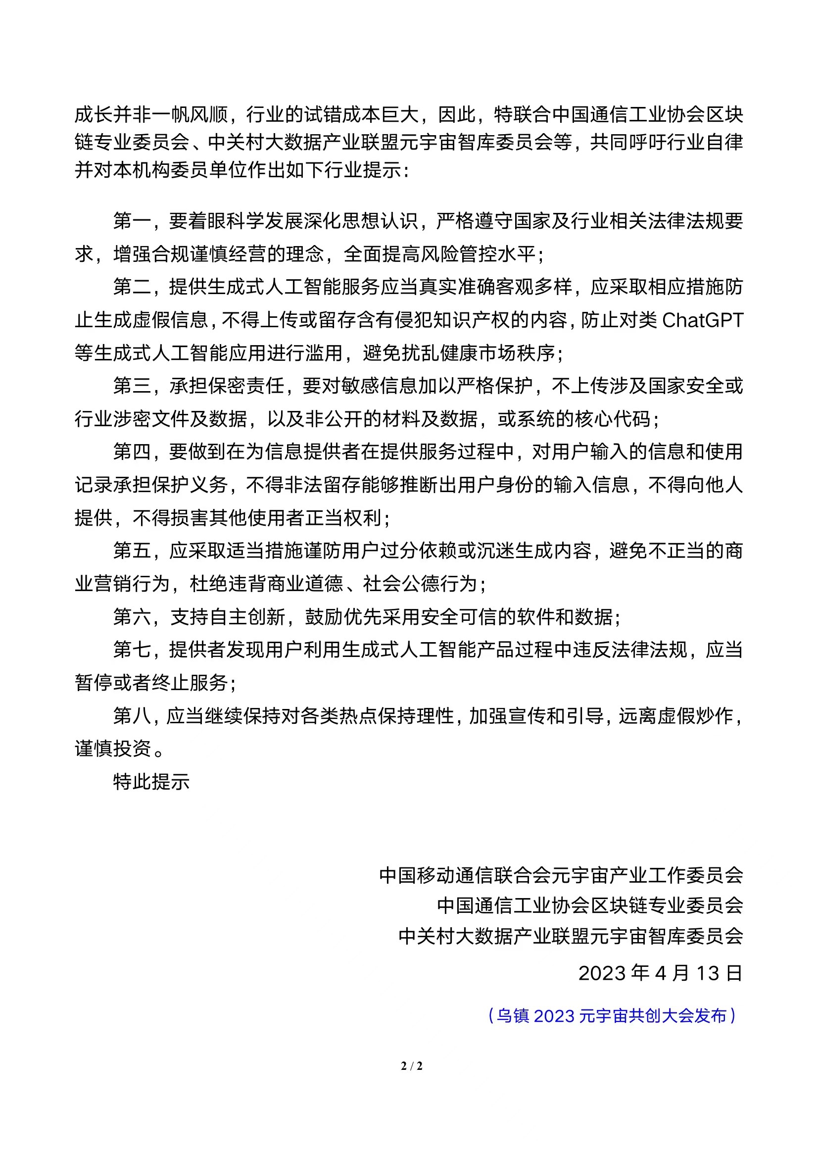 中国移动通信联合会等联合发布行业提示:防止对类ChatGPT等生成式人工智能应用进行滥用
