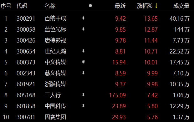 上证报中国证券网讯 4月13日,传媒板块走强,截至9:35,中文传媒、慈文传媒、浙版传媒涨停,百纳千成、蓝色光标、唐德影视、世纪天鸿等涨超10%。