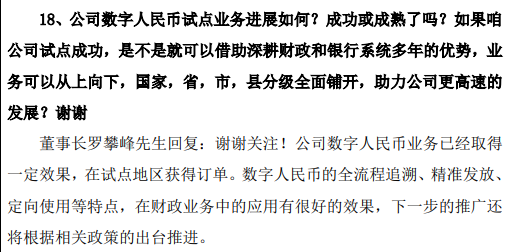 上证报中国证券网讯 中科江南在4月19日披露的投资者关系活动记录表中表示,公司数字人民币业务已经取得一定效果,在试点地区获得订单。数字人民币的全流程追溯、精准发放、定向使用等特点,在财政业务中的应用有很好的效果,下一步的推广还将根据相关政策的出台推进。
