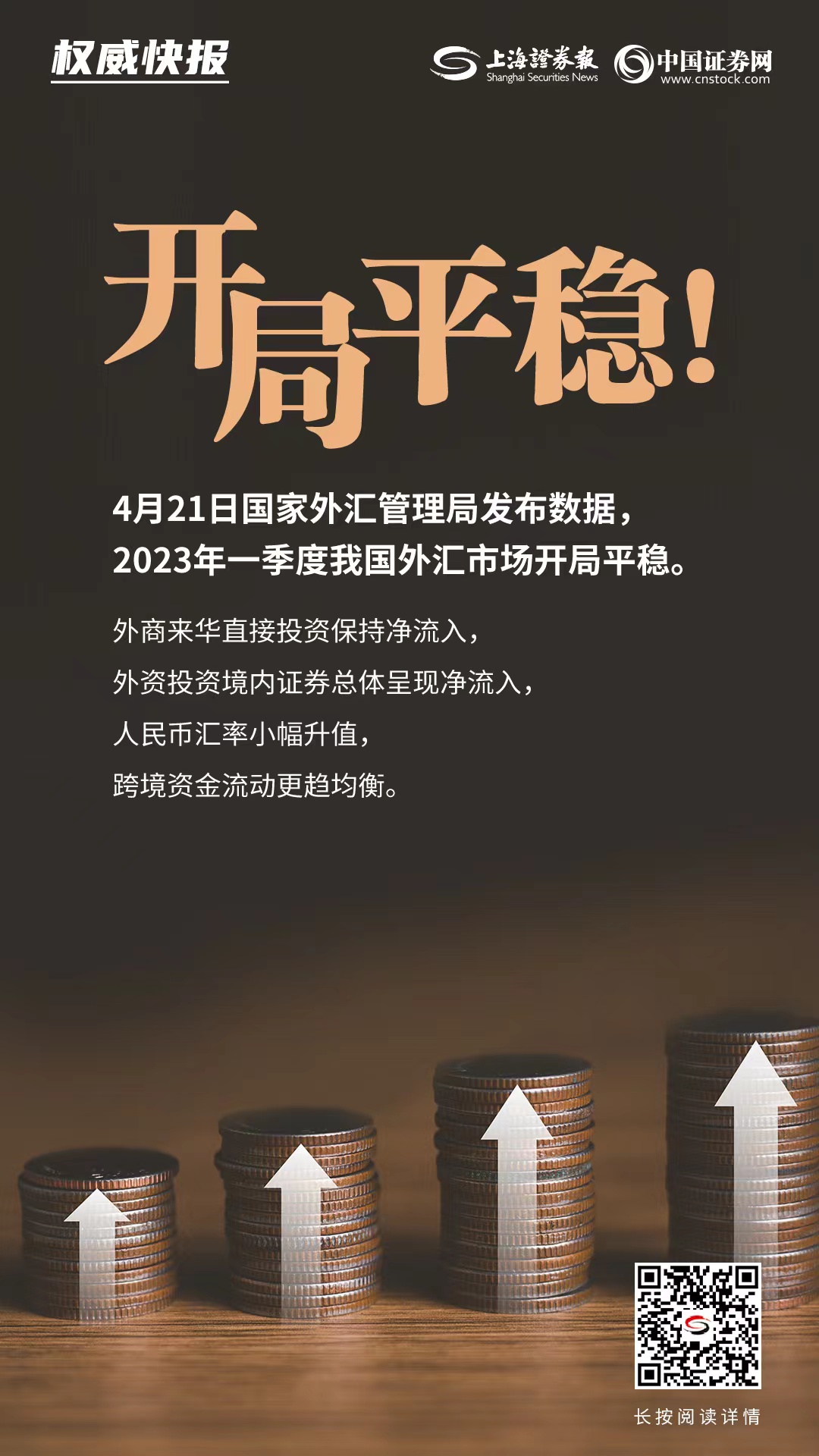 上证报中国证券网讯(记者 范子萌)“2023年一季度,全球经济下行风险增加,主要发达经济体货币政策紧缩幅度放缓,国际金融市场形势仍存在不确定性因素。面对复杂的外部环境,我国外汇市场开局平稳,人民币汇率小幅升值,跨境资金流动更趋均衡。”