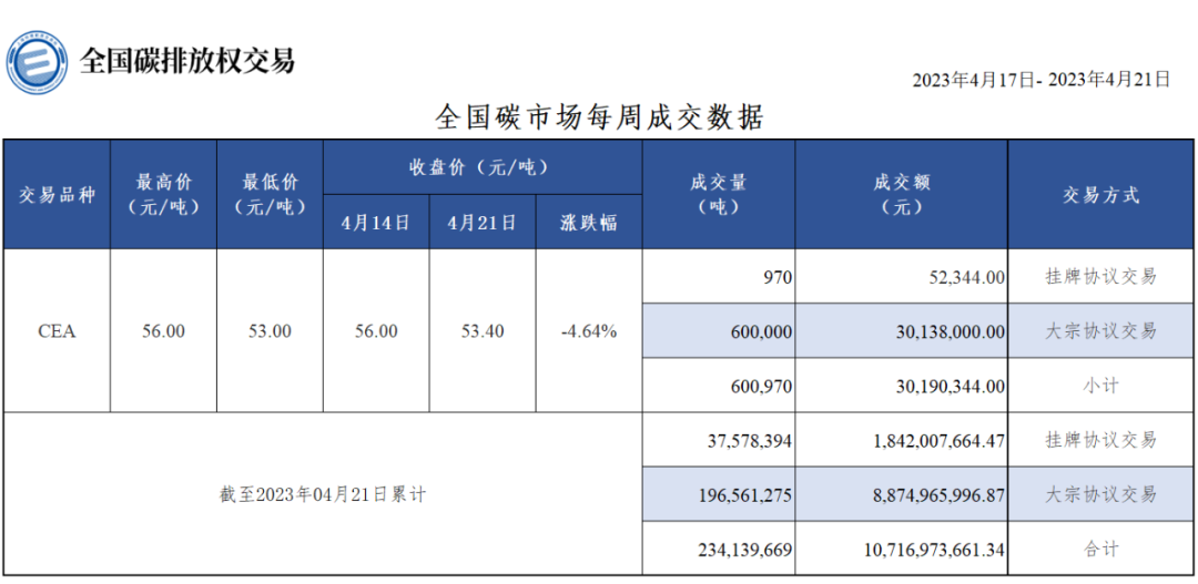 截至本周,全国碳市场碳排放配额(CEA)累计成交量234,139,669吨,累计成交额10,716,973,661.34元。