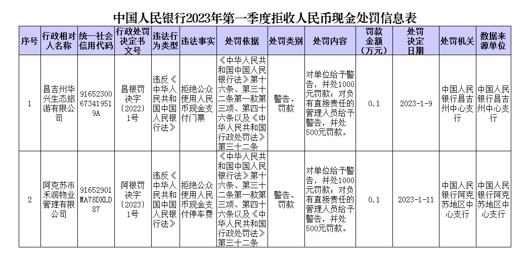 2023年第一季度,人民银行依法对2家拒收人民币现金的单位及相关责任人作出经济处罚。