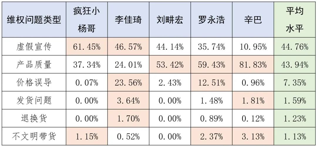 汇总分析有关主播带货维权舆情数据发现,疯狂小杨哥、李佳琦、刘畊宏、罗永浩、辛巴等五位主播的维权舆情占到本次采集主播舆情的90.97%。这五位主播的直播带货维权舆情反映的问题,主要涉及虚假宣传、产品质量、价格误导、发货问题、退换货和不文明带货等方面,但虚假宣传、产品质量和价格误导均占到总体舆情的90%以上。此外,不同主播反映的具体问题也存在一定差异。