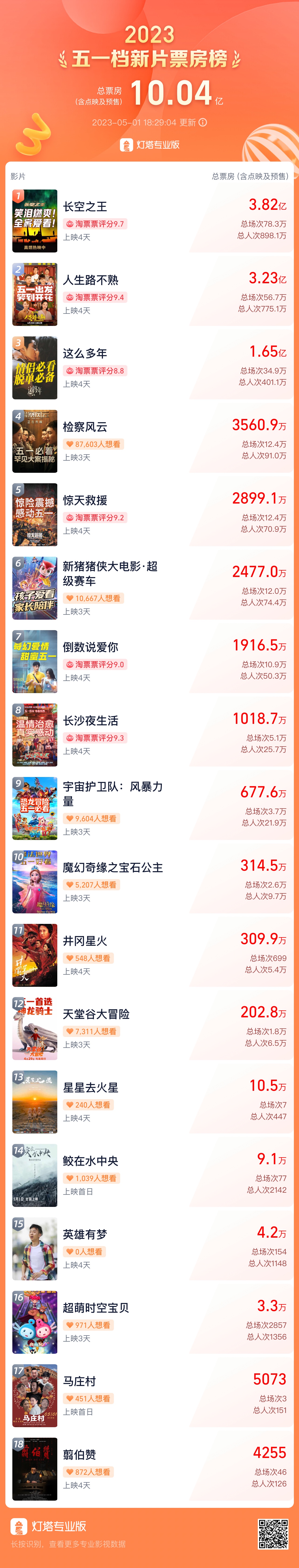 上证报中国证券网讯 根据灯塔专业版数据,截至5月1日18时29分,2023年五一档新片总票房突破10亿元,其中票房排名前三的影片分别是《长空之王》《人生路不熟》《这么多年》。