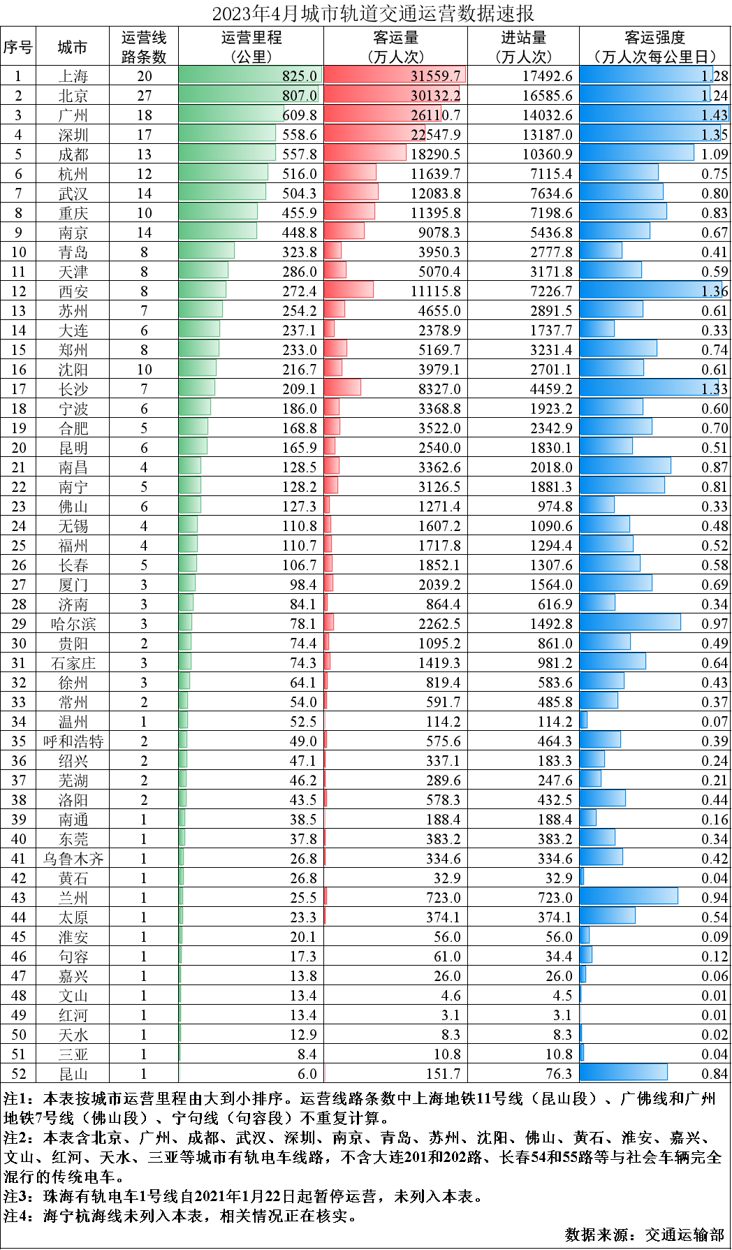 上证报中国证券网讯 据交通运输部消息,2023年4月城市轨道交通运营数据速报公布。2023年4月,31个省(自治区、直辖市)和新疆生产建设兵团共有54个城市开通运营城市轨道交通线路292条,运营里程9652.6公里,实际开行列车311万列次,完成客运量25.3亿人次,进站量15.2亿人次。4月份,客运量环比减少0.1亿人次、降低0.5%,同比增加12.4亿人次、增长95.8%,较2019年月均客运量增加5.4亿人次、增长27.3%。4月份客运强度平均水平为0.552万人次每公里日,较2019年全年客运强度平均水平增长1.2%。本月无新增运营线路和区段。