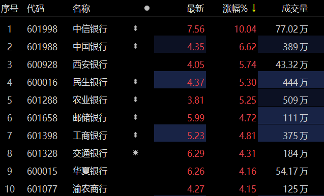 银行板块走高 中信银行涨停