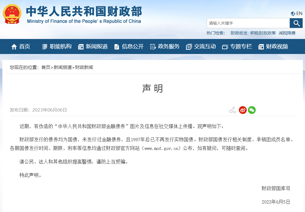 财政部声明:未发行过金融债券 且1997年后已不再发行实物国债