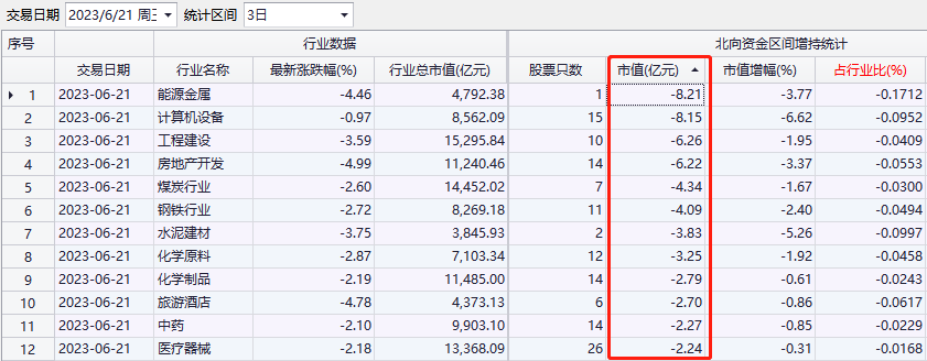 上证报中国证券网讯 Choice数据统计,本周(6月19日-21日)北向资金净卖出3.46亿元,期间加仓前三的行业是文化传媒、软件开发和家电行业,分别加仓10.83亿元、9.4亿元、9.2亿元;减持前三的行业是能源金属、计算机设备和工程建设,分别减持8.21亿元、8.15亿元、6.26亿元。