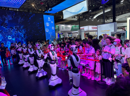 “你好。”伴随孩子的一声问候,一台机器人缓缓抬起手臂,和孩子轻轻握手。在达闼展台前,记者看到机器人成列队表演着舞蹈,手部灵活的动作让孩子们连连惊叹。