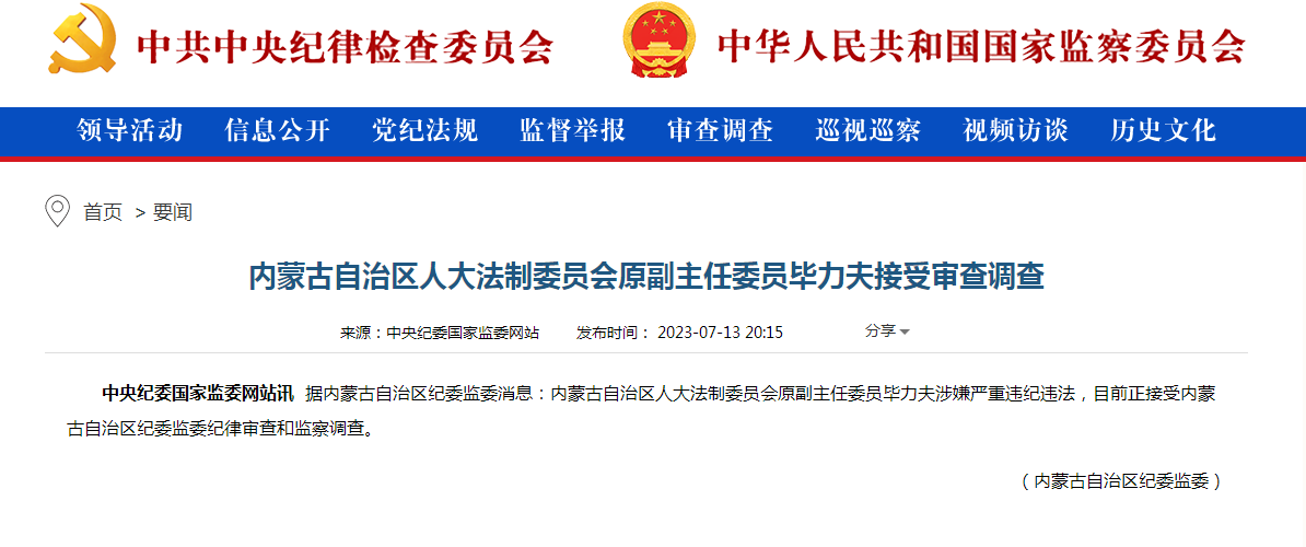 上证报中国证券网讯 据中央纪委国家监委网站7月13日消息,内蒙古自治区人大法制委员会原副主任委员毕力夫涉嫌严重违纪违法,目前正接受内蒙古自治区纪委监委纪律审查和监察调查。