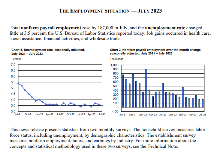 上证报中国证券网讯 美国劳工统计局8月4日公布的数据显示,美国7月季调后非农就业人口增加18.7万人,低于市场预期的20万人。6月份非农新增就业人数从20.9万人下修至18.5万人。自2020年疫情发生以来,就业增长首次连续两个月低于20万人以下。美国7月失业率则从3.6%降至3.5%。