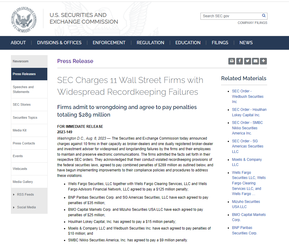 上证报中国证券网讯 美国证券交易委员会(SEC)当地时间8月8日公告,对10家经纪交易商、1家双重注册的经纪交易商和投资顾问公司提出指控,原因是这些公司及其员工存在未持续维护和保存电子通信记录等不当行为。受到指控的11家机构承认其行为违反了美国证券法的相关条例,并同意支付合计2.89亿美元的罚款。