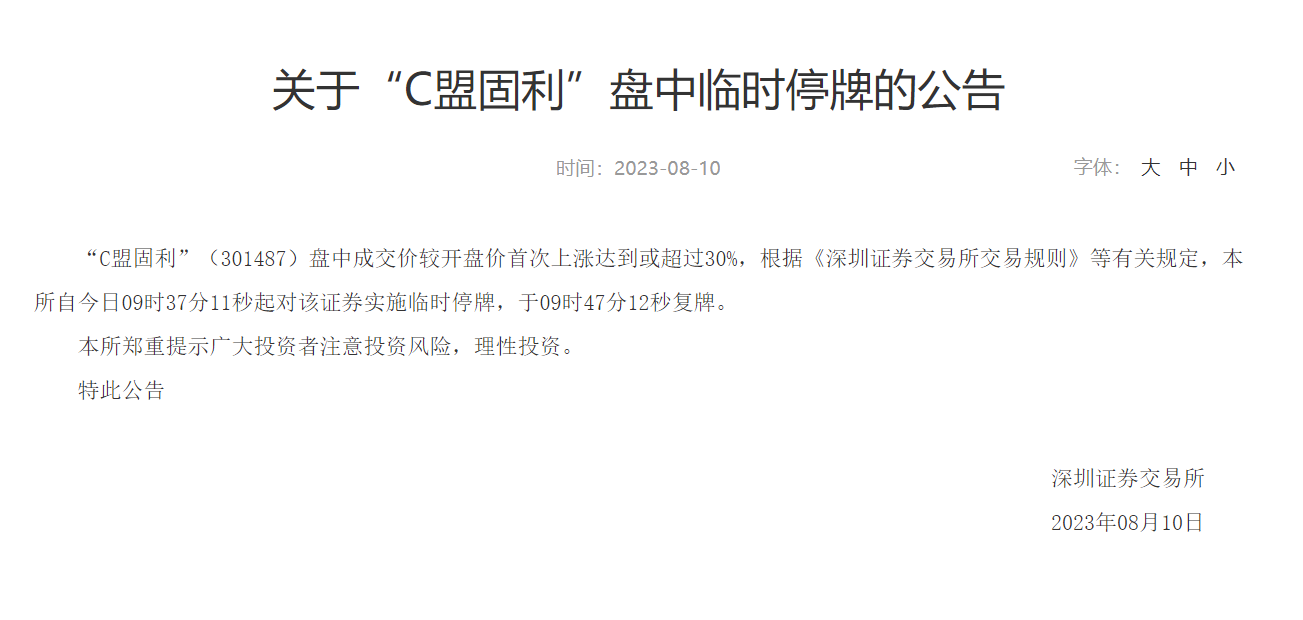 深交所:“C盟固利”盘中临时停牌