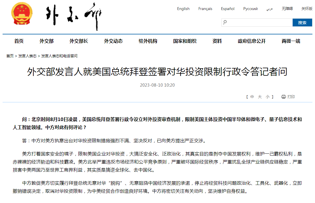 外交部发言人就美国总统拜登签署对华投资限制行政令答记者问