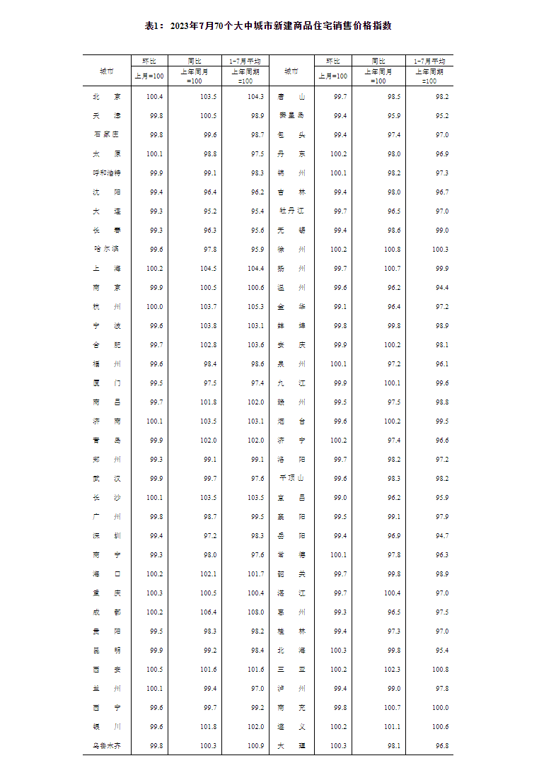 7月份,70个大中城市中,新建商品住宅和二手住宅销售价格环比上涨城市分别有20个和6个,比上月分别减少11个和1个。