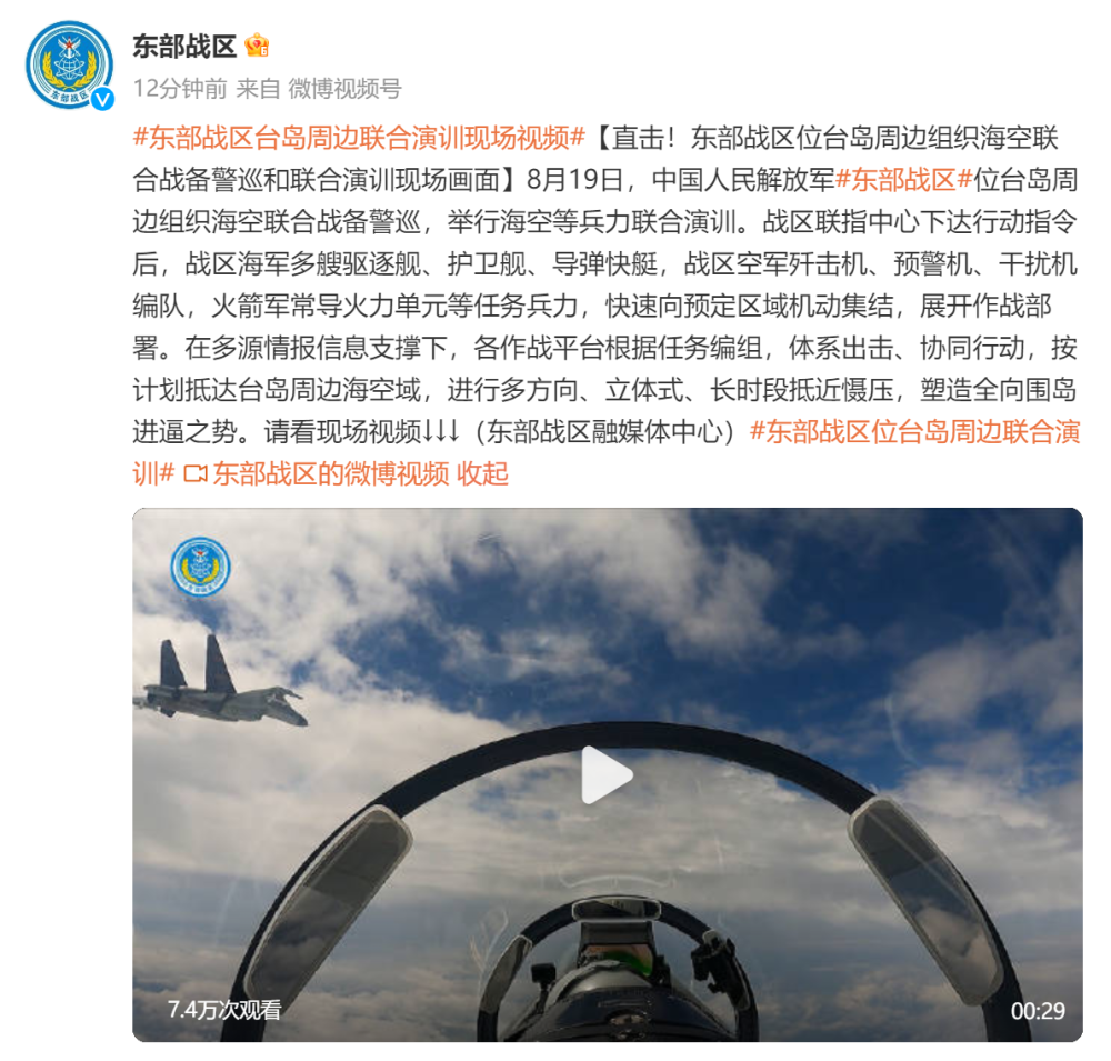 【直击!东部战区位台岛周边组织海空联合战备警巡和联合演训现场画面】8月19日,中国人民解放军东部战区位台岛周边组织海空联合战备警巡,举行海空等兵力联合演训。战区联指中心下达行动指令后,战区海军多艘驱逐舰、护卫舰、导弹快艇,战区空军歼击机、预警机、干扰机编队,火箭军常导火力单元等任务兵力,快速向预定区域机动集结,展开作战部署。在多源情报信息支撑下,各作战平台根据任务编组,体系出击、协同行动,按计划抵达台岛周边海空域,进行多方向、立体式、长时段抵近慑压,塑造全向围岛进逼之势。(东部战区融媒体中心)