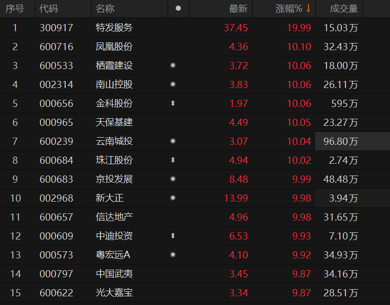 房地产板块掀涨停潮 特发服务等十余股涨停