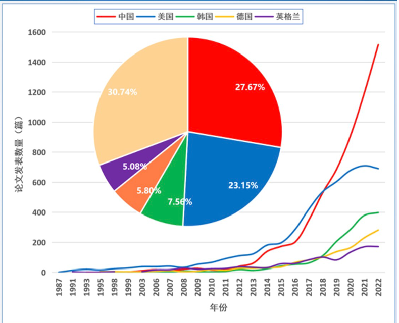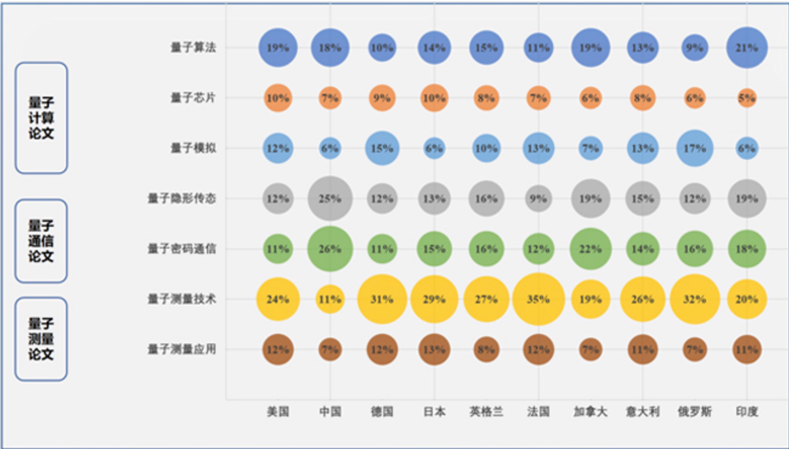中国在量子密码通信领域中的论文数占创新大国总论文数的26%,也是创新大国中发表该领域论文最多的国家。同时,中国也是量子隐形传态领域中论文数量最多的国家,占比25%。
