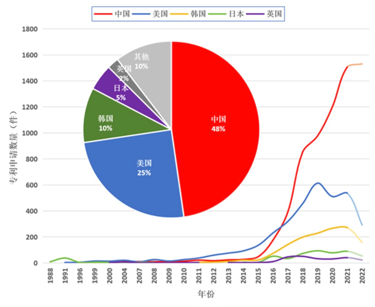 基础科学研究呈现爆发式增长。《报告》显示,2013年之前,类脑芯片的全球论文数量尚不足500篇,2016年已经飙升至1000篇,2022年更是达到了约4000篇。类脑芯片专利申请量在2015年后异军突起,从2015年的不到300件升至2021年超2600件。